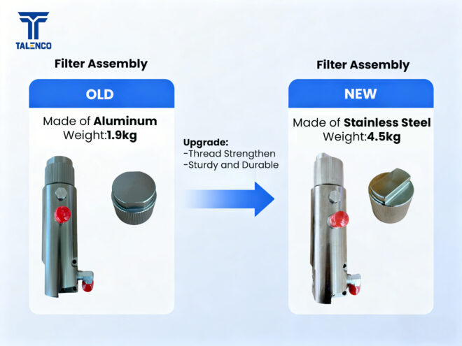 SHAGNHAI TALENCO have upgraded a key part of our sprayers – the filter assembly – from aluminum to stainless steel. The thread design has also been made stronger. Why? Stainless steel is more resistant to corrosion, high pressure, and impact. It handles different coatings, solvents, and wet conditions much better. The strengthened threads reduce the…